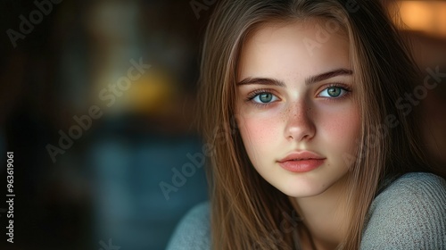 Young woman with striking blue eyes gazes softly in cozy café setting