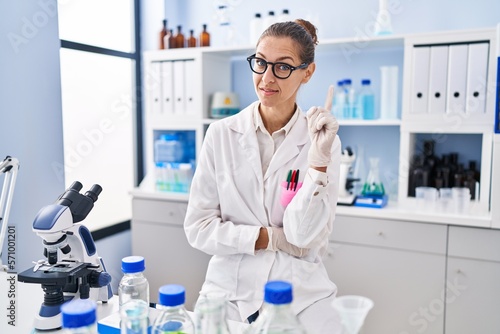 Young woman working at scientist laboratory smiling with an idea or question pointing finger up with happy face, number one