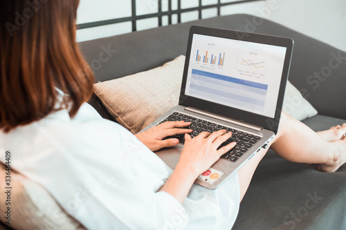 young woman working on laptop computer while sitting at the living room. work from home concept
