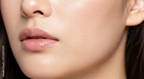 Young womans close-up portrait highlights her smooth skin and natural makeup, focusing on her lips and facial features against a soft, neutral backdrop, conveying beauty and grace
