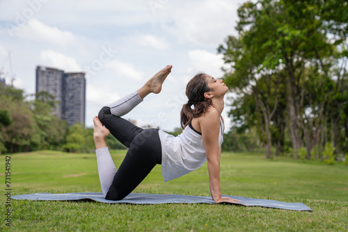 Young women have beautiful bodies, Playing yoga in an elegant posture, in the green park, is a concept of people's recreation and health care concept. blurred background