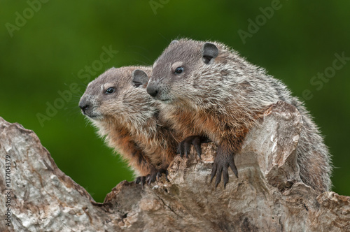 Young Woodchucks (Marmota monax) Look Left from Atop Log