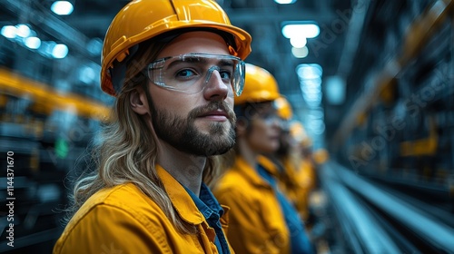 Young Worker in Safety Gear with Long Hair in Industrial Setting