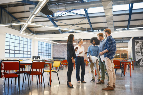 Your average day in the office. Full length shot of a group of designers talking while standing around in their office.