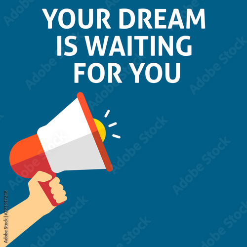 YOUR DREAM IS WAITING FOR YOU Announcement. Hand Holding Megaphone With Speech Bubble