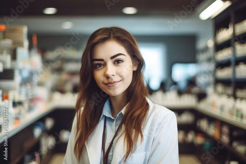 Your pharmacist is here. Attractive young female pharmacist working in a pharmacy. Generative ai.