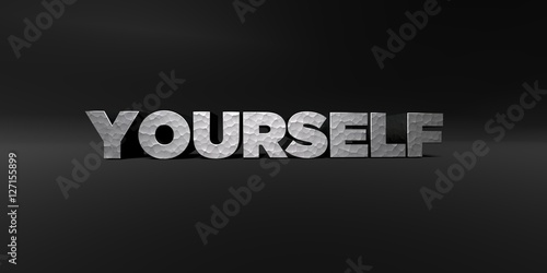 YOURSELF - hammered metal finish text on black studio - 3D rendered royalty free stock photo. This image can be used for an online website banner ad or a print postcard.