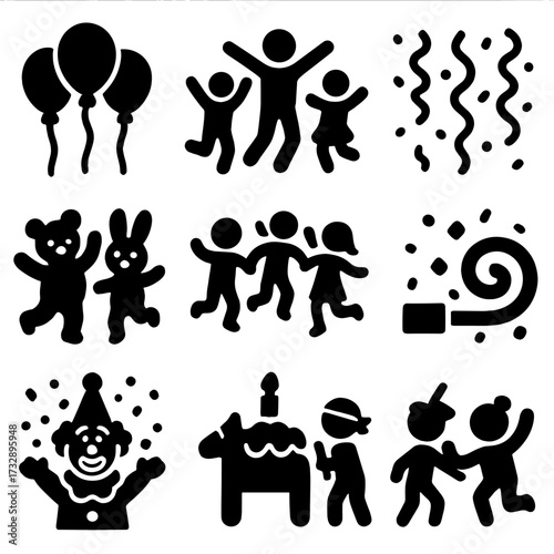 Youth Celebration Icons. Solid style icons of youth-centered celebration: school party balloons, kids jumping icon, cupcake tower,