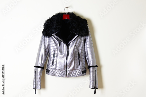 Youth short sheepskin coat metallic colors on a sheepskin collar. Fur coat isolated on a grey background. Outerwear.