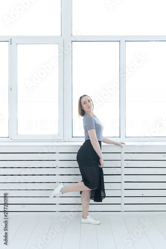 Youth, style and people concept - young woman on black skirt and sneakers standing near the window