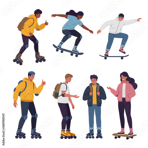 Youthful figures engage in rollerblading and skateboarding activities in a vibrant illustration