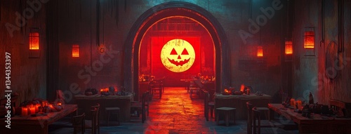 Youthful medieval room featuring Jack O' Lanterns and a Halloween banner with copy-space