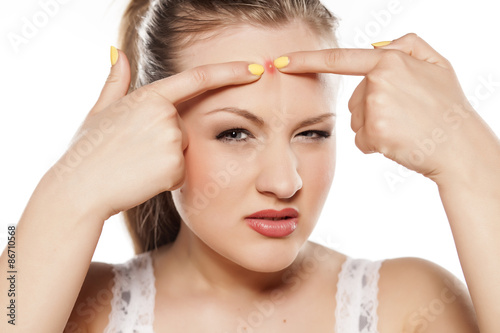 yoyoung blonde squeezes a pimple on her forehead
