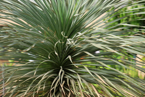 Yucca has hard, sword-shaped leaves with sharp, thorn-like tips. The leaves are grayish green to blue-green. Is succulent plant. The Trunk is tall, leaves do not have thorns, but have very fine teeth
