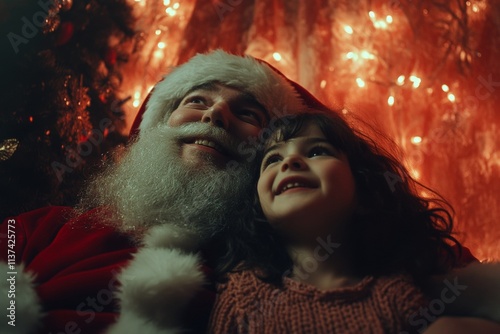 Yuletide promotion idea snapshot for flyer and social media use. Happy christmas, Ñute child girl happy with santa claus. Festive celebration graphics. Santa claus red toddler. Winter sales ads.