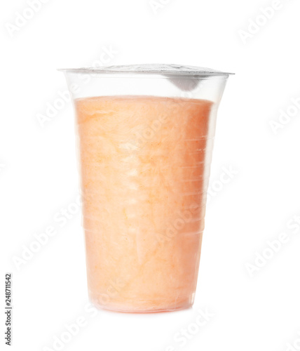 Yummy cotton candy in plastic cup on white background