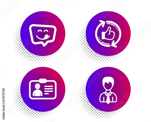 Yummy smile, Refresh like and Id card icons simple set. Halftone dots button. Businessman sign. Emoticon, Thumbs up counter, Human document. User data. People set. Vector