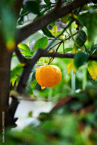 Yuzu With Waterdroplets on a Tree
