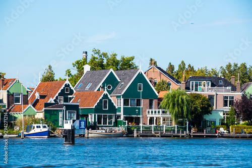Zaanse Schans, Netherlands - 1 October 2019: Tourists sightseeng traditional Dutch rural houses in Zaanse Schans, is a typical small village within Amsterdam area.