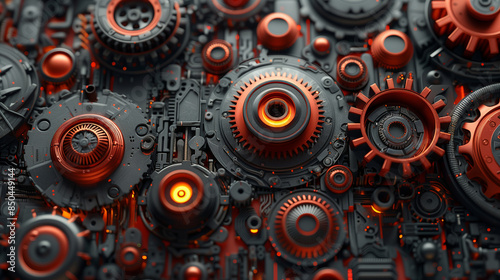 Zahlreiche orangefarbene Zahnräder sitzen auf einer computerähnlichen Platine, Hintergrund in Vogelperspektive