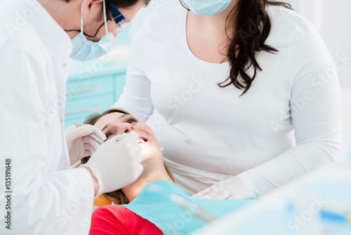 Zahnarzt behandelt Zähne von Frau mit Bohrer