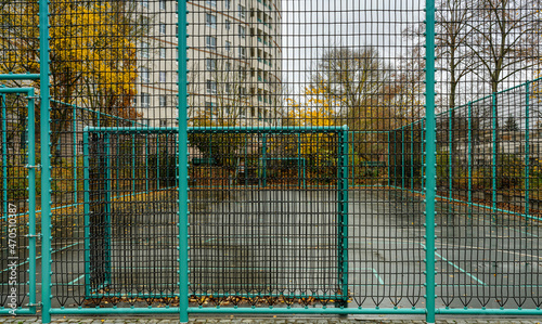 Zaun an einem kleinen Fußballfeld in einer Wohnsiedlung in Berlin