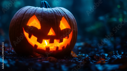 Zbliżenie na dyniową latarnię na wieczornym tle. Świecąca wnętrze oświetla wyrzeźbione oczy i uśmiech, tworząc straszliwy efekt.