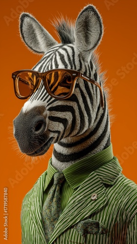 Zebra dressed in a green suit and sunglasses poses with confidence against an orange background