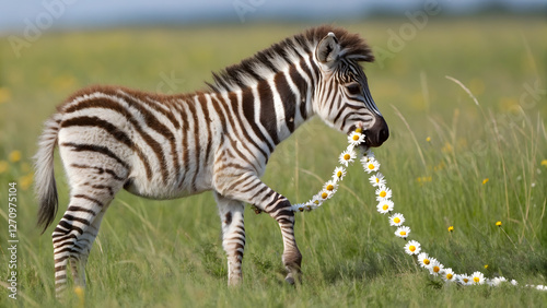 Zebra foal with a playful mood holding a daisy chain in a sunny meadow