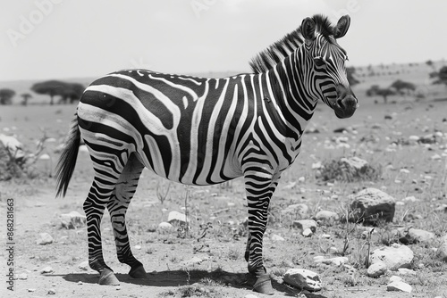 Zebra standing on dusty ground, a classic black and white portrait highlighting its unique stripes. Concept of wildlife, safari, Africa