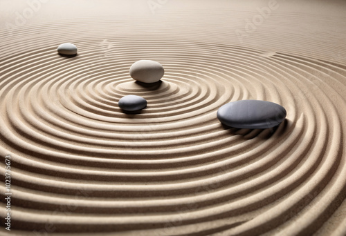 Zen garden with smooth stones arranged in wavy sand patterns for relaxation