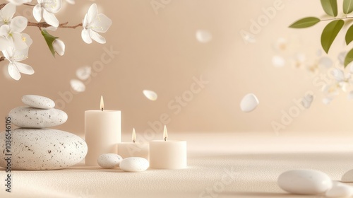 Zen stones, candles and white flower on beige background witn copy space, wellness and harmony, massage and bodycare, spa and wellness con