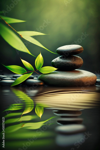 zen stones on water and bamboo background, spa concept. Generative AI,