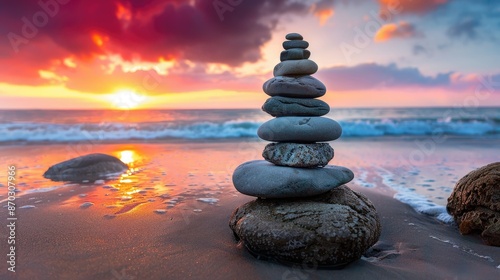 Zen-like rock pyramid on serene beach under vibrant sunset colors