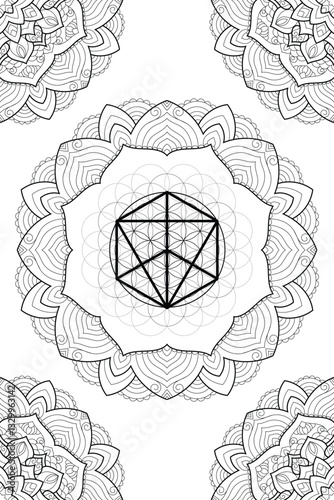 Zentangle Ornamental Black and White Design – Intricate Hand-Drawn Patterns with Sacred Geometry Symbols for Mindfulness, Meditation, and Spiritual Art