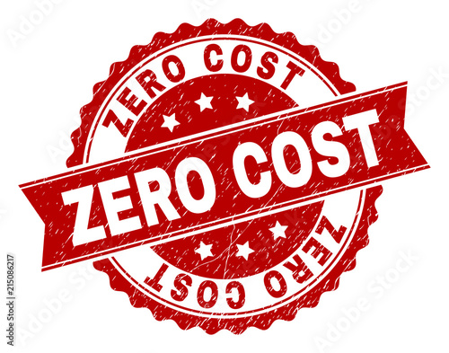 ZERO COST seal print with distress texture. Rubber seal imitation has circle medal shape and contains ribbon. Red vector rubber print of ZERO COST caption with grunge texture.