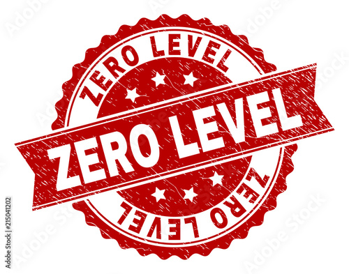 ZERO LEVEL seal stamp with corroded texture. Rubber seal imitation has circle medal shape and contains ribbon. Red vector rubber print of ZERO LEVEL title with corroded texture.