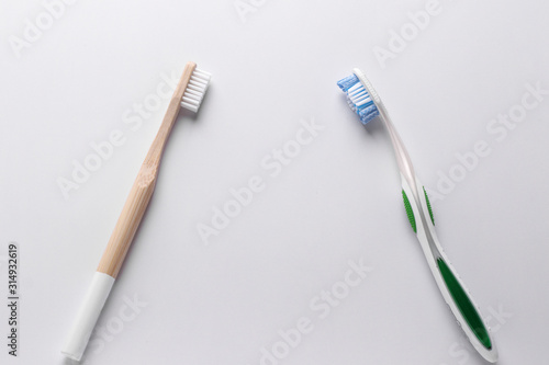 Zero waste concept, Eco wooden toothbrush vs plastic toothbrush on white background: Reduce, Reuse and Recycle concept. Flat lay, View from above