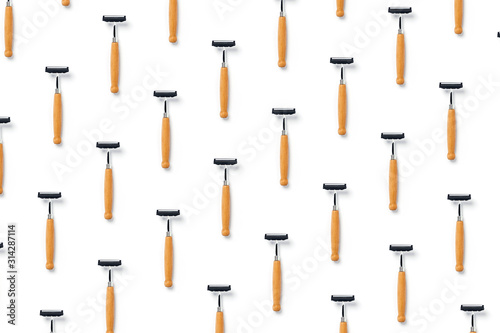 Zero waste concept. Group of razors with wooden handles on isolated white background. Flat lay, top view, copy space.
