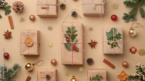 Zero waste handmade gift boxes on beige background for New Year and Christmas celebrations top view