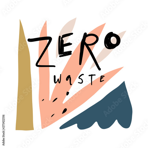Zero waste handwritten sign with modern abstract shapes. Isolated illustration on white background, stylish print for poster, banner or bag. Scandinavian style. Vector.