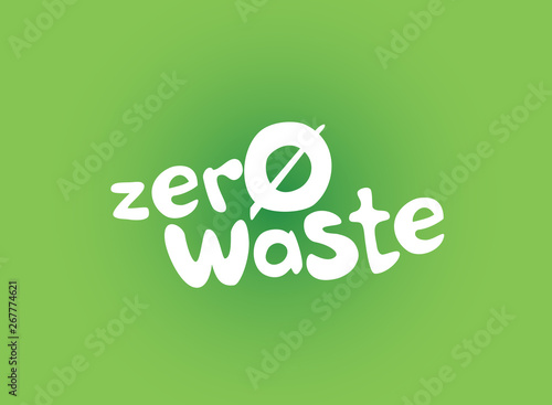 Zero waste handwritten text title sign with green background. Waste management concept isolated illustration on white background.