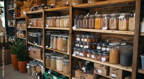 Zero waste shop interior details. Wooden shelves with different food.