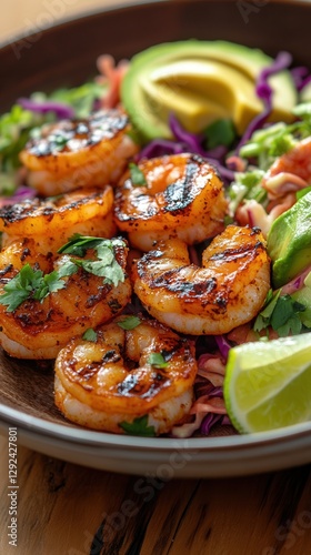 Zesty grilled shrimp on a vibrant bed of fresh slaw garnished with lime and herbs. Generative AI