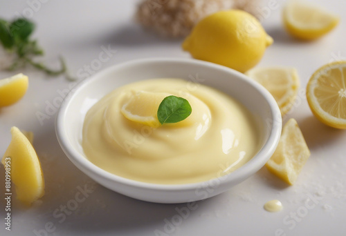 zesty lemon butter sauce in a small dish, garnished with a lemon twist, ad shot, copy space for text