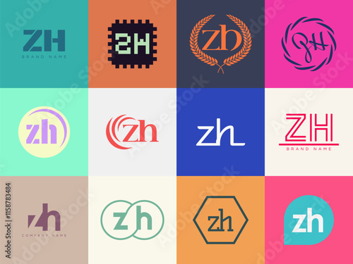 ZH logo company template. Letter z and h logotype. Set different classic serif lettering and modern bold text with design elements. Initial font typography.