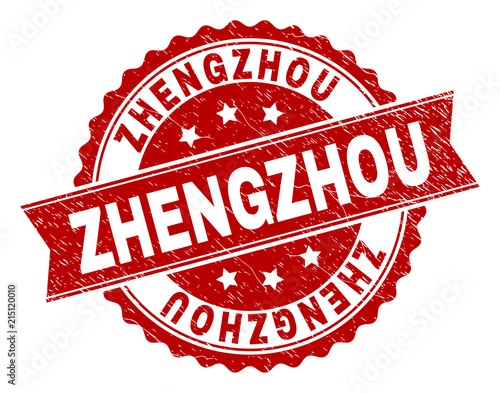 ZHENGZHOU seal print with corroded texture. Rubber seal imitation has round medallion form and contains ribbon. Red vector rubber print of ZHENGZHOU tag with unclean texture.