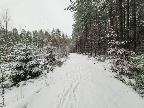 Zima w lesie, drzewa i droga pokryte warstwą śniegu.