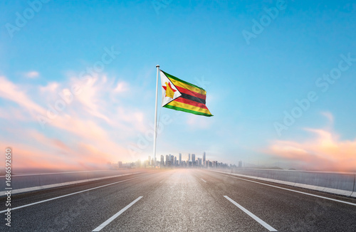 Zimbabwe national flag with mast waving with beautiful skyline. A view from highway. Zimbabwe flag for Republic Day and Independence Day.