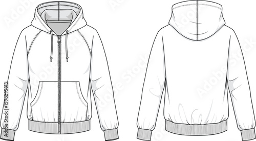 zip up hoodie technical flat sketch front back view with hood pocket rib cuff cad drawing flat vector illustration